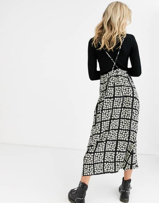 ASOS DESIGN daisy grid print midi pinafore skirt with tie straps Very well made.